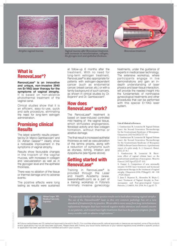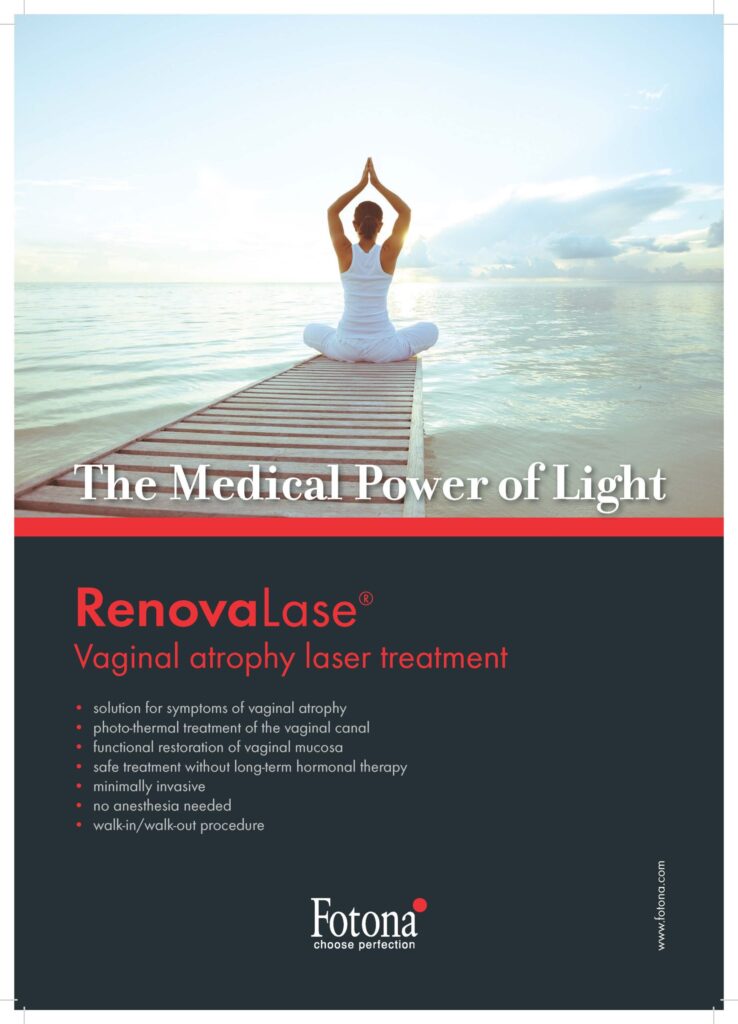 RENOVALASE laser treatment is a gentle and painless method of rejuvenating the vaginal and urethral mucosa, a way to improve moisture and mucosal immunity. Laser energy from the Erbium:YAG 2940 nm laser is applied to the vaginal and urethral areas using special mirrors.